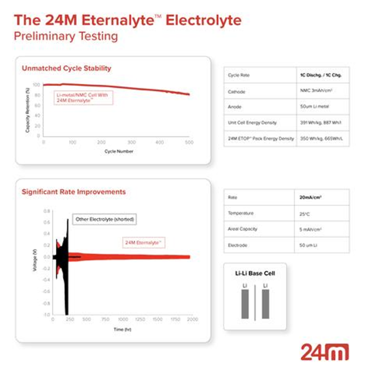 Lithium-metal batteries, especially those with liquid electrolytes, are known for an inconsistent cycle life caused by lithium or other metal dendrites. 24M has reported that Eternalyte™ has achieved the highest cycle stability among liquid electrolyte systems under 20mA/cm2 plating/stripping current.